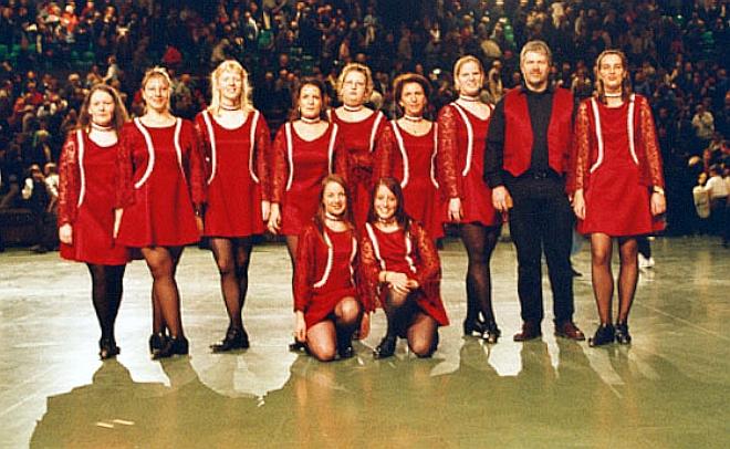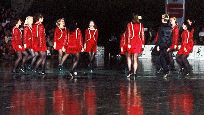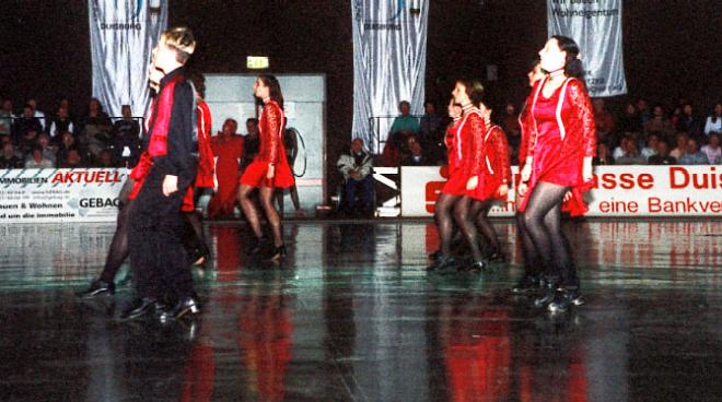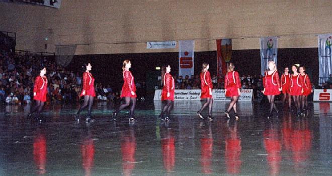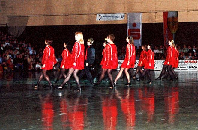 Wir durften uns sehr geehrt fühlen, zwischen Europa- und Weltmeistern im Turnen und Tanzen eine Kostprobe unseres Könnens abliefern zu dürfen. Unseren Reel tanzen wir zwar mit mehr Leuten als bei den Tanztagen, aber auch die verlieren sich in der riesigen Halle. |
